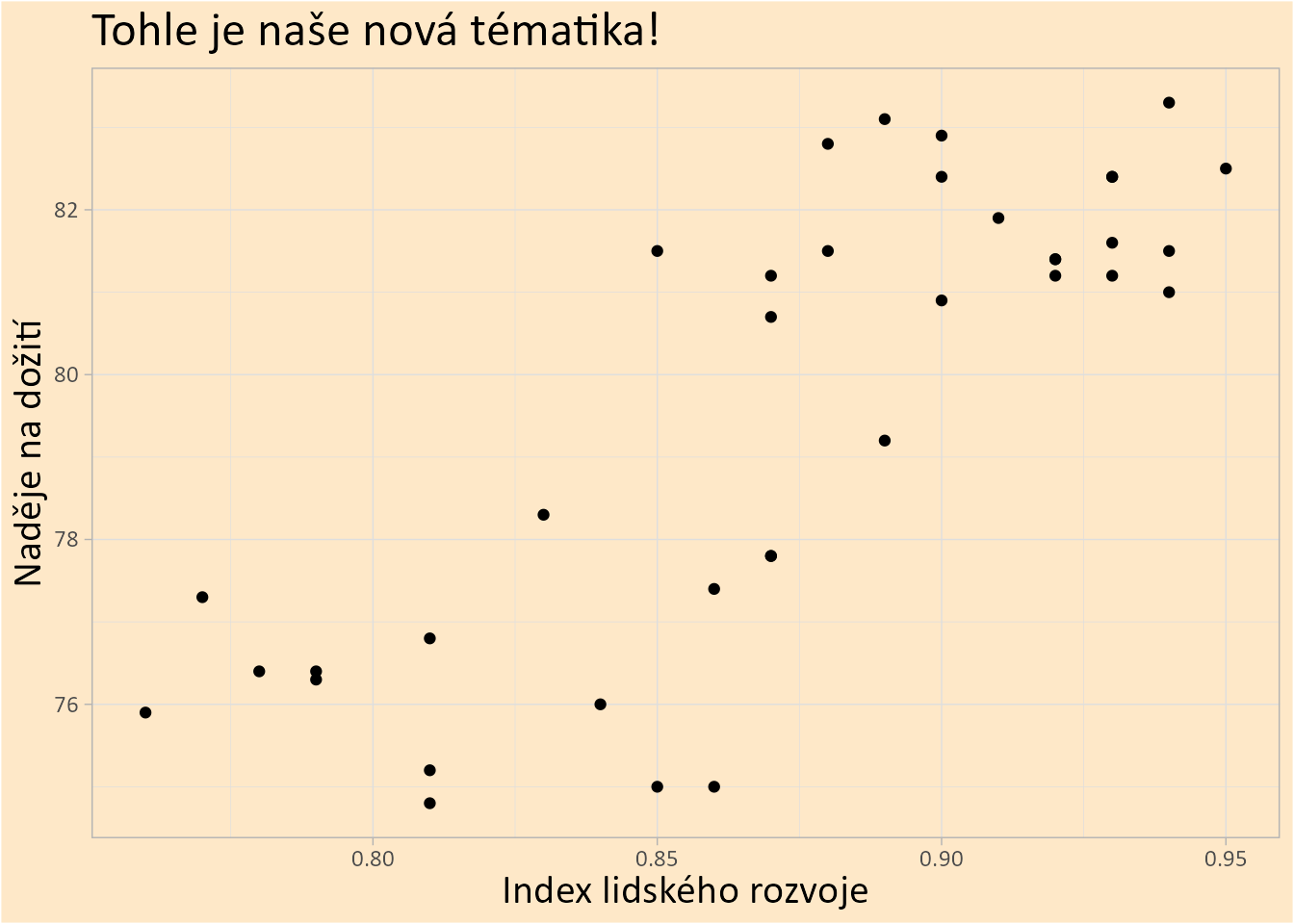 O něco komplexnější, ale také velmi častou vlastní funkcí je vlastní tématika pro grafy vytvoření balíčkem ggplot2. V praxi se často dostaneme do situací, kdy je třeba aby všechny naše grafy měli jednotný vzhled. Vypisovat pokaždé ty samé argumenty do funkce theme()